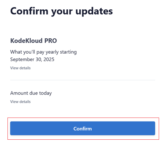 Upgrading your KodeKloud subscription is a seamless process that allows you to access more advanced features and courses without waiting for your current plan to expire. Any unused credits from your existing plan will be adjusted on a pro-rata basis, and you'll only pay the difference for the new plan. Follow this step-by-step guide to upgrade your subscription to the Pro plan and review all renewal details before finalizing.