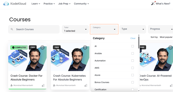 If you're interested in exploring courses offered by a particular tutor, simply click on the Tutor and choose the tutor's name. For instance, if we select Mumshad Mannambeth, you can view all the courses taught by him.