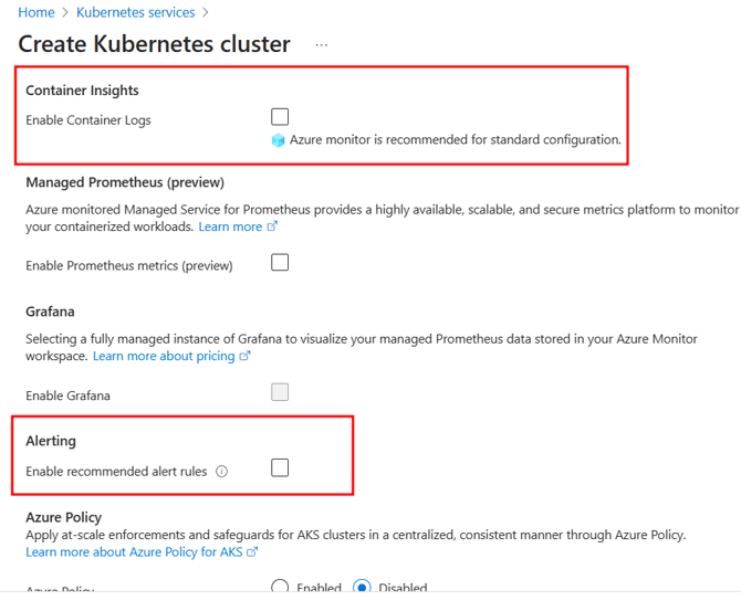 - Please make sure that "Container Insights" and "Alerting" are Disabled